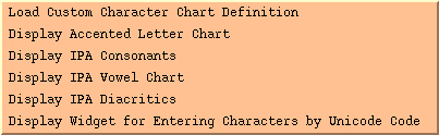 This command pops up a palette of diacritics in the International Phonetic Alphabet. Clicking on a button inserts the associated character into whatever window has the input focus. For some sounds a different character is widely used in North America. Such "North American IPA" characters are are inserted by clicking with the right mouse button (Control-Mouse Button for Mac users) instead of the left. The button labels normally display the standard IPA characters; if there is also a North American variant it replaces the standard character on the button when the mouse pointer is over the button.