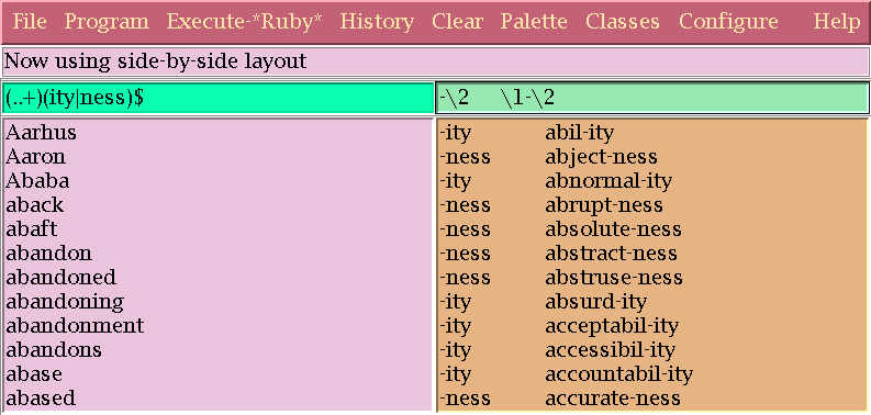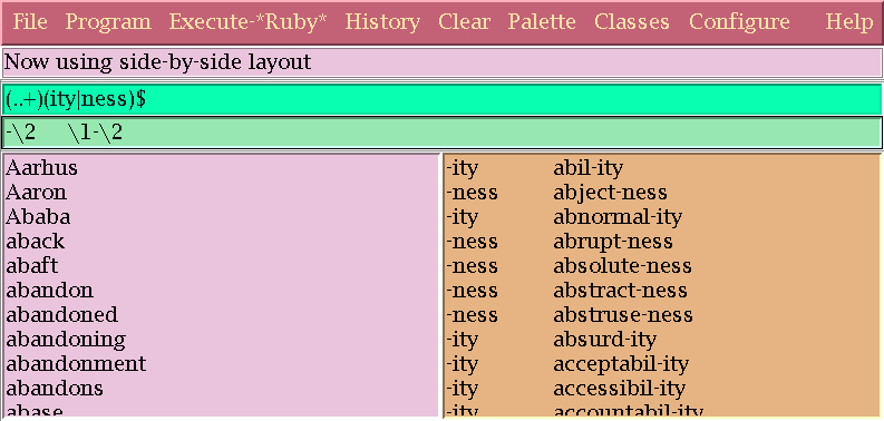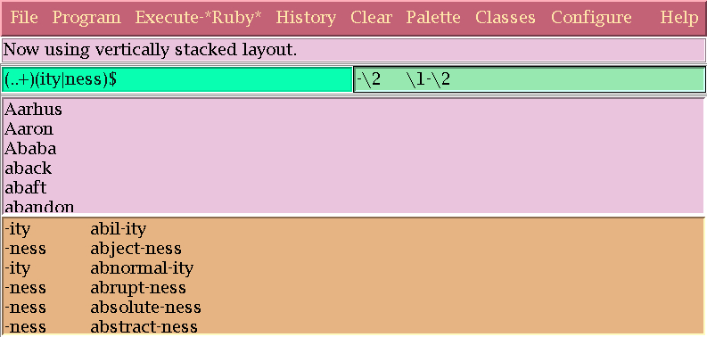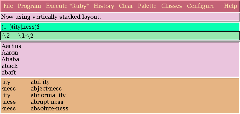 The basic display consists of five stacked layers: a menu bar, a message region, in which messages are displayed, a region in which to enter regular expressions, the input data window, and the output window, in which the result of executing the regular expression is displayed. Here is a typical display: