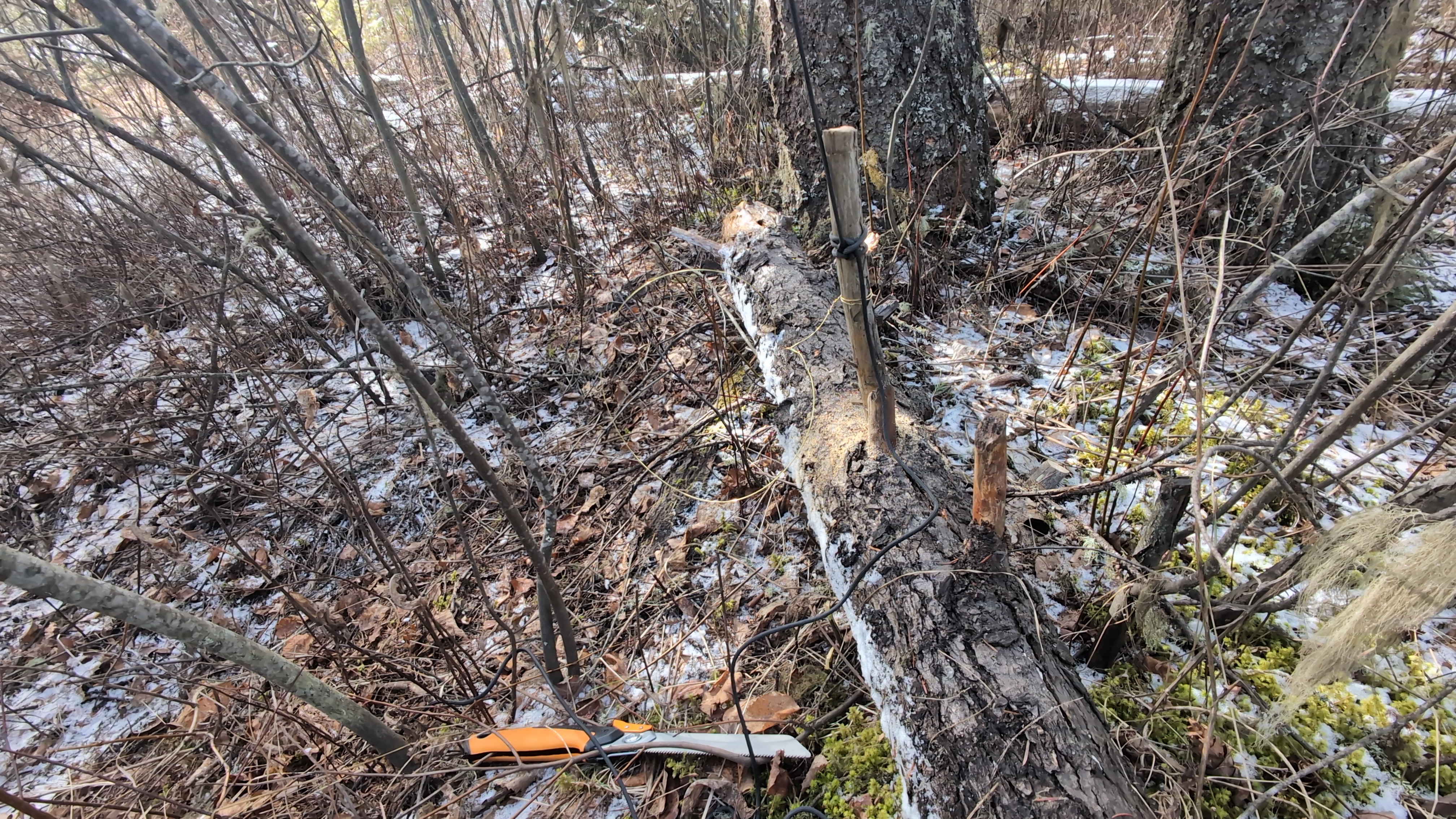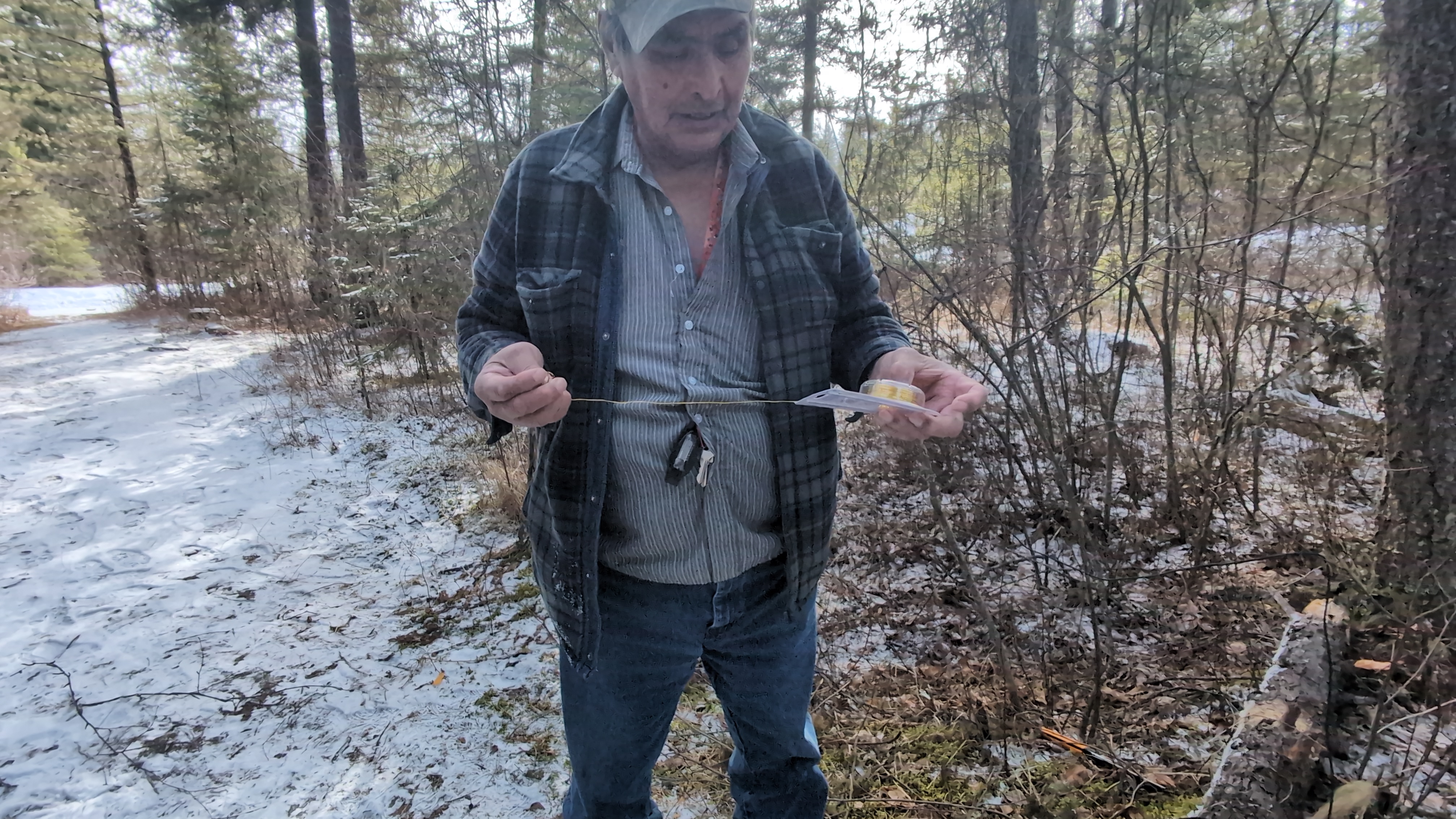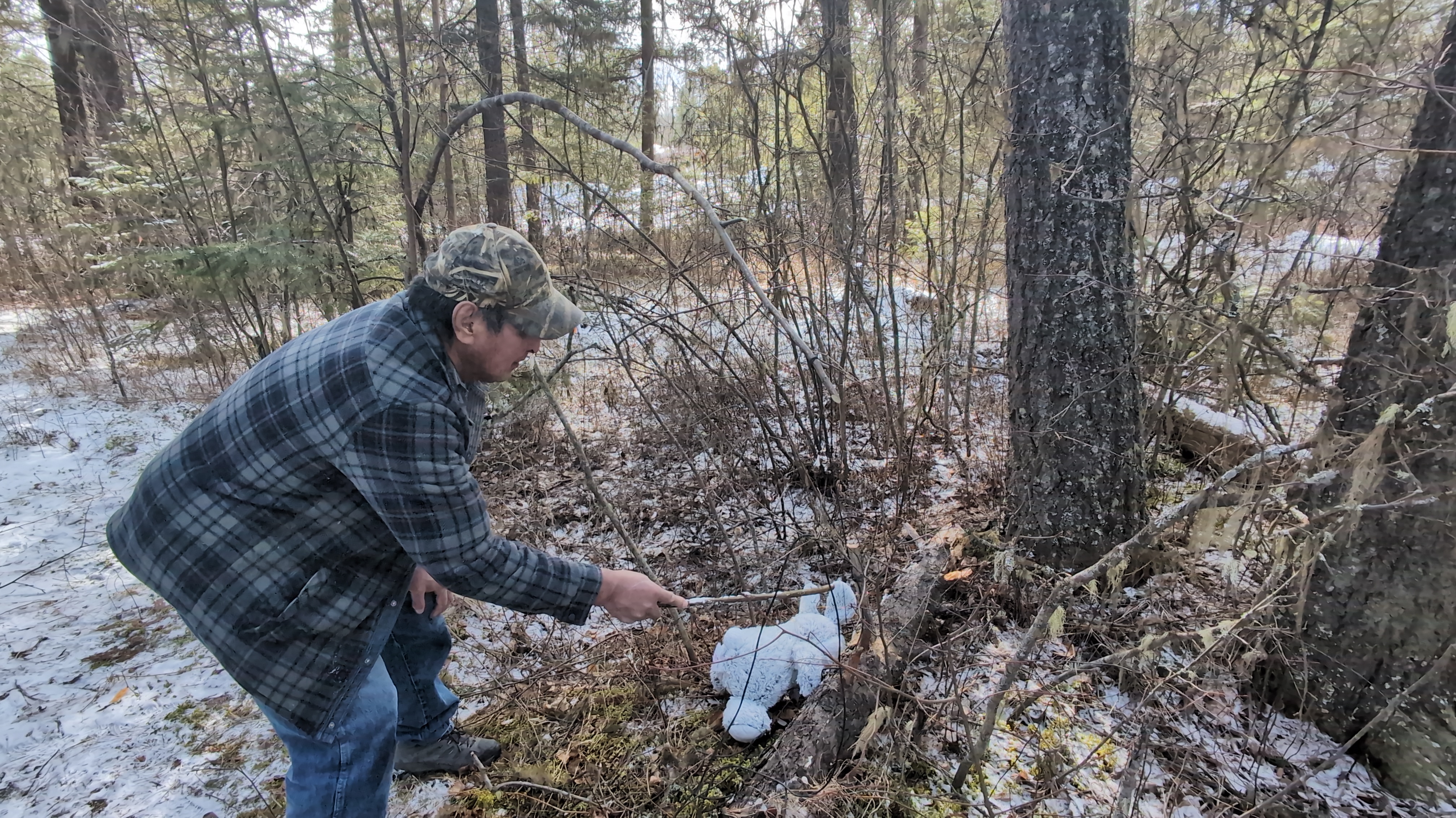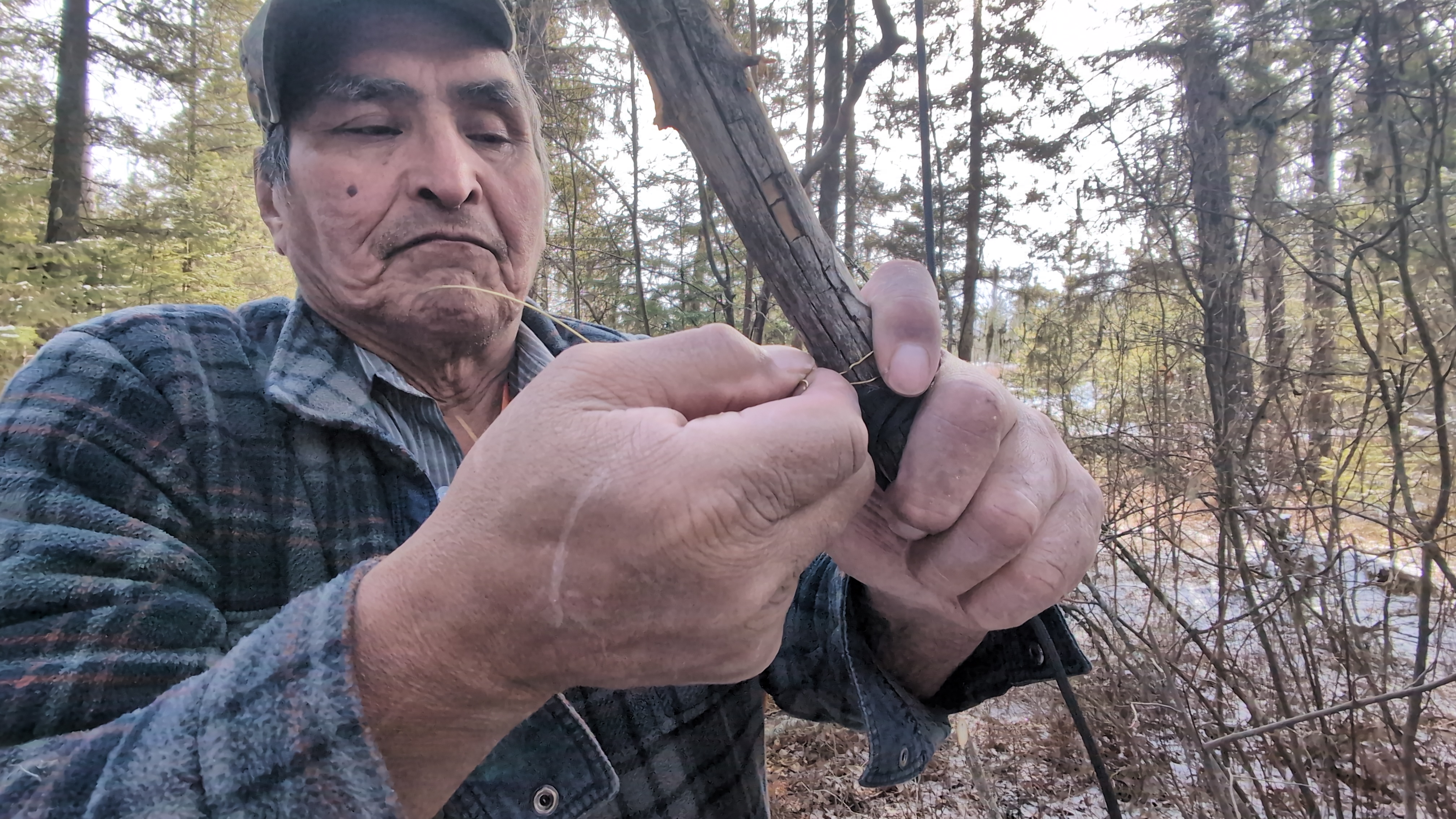 .jpg) | Hook the trigger stick to the stake that is in the ground (The trap would normally be set into the ground but if the ground is too frozen, a counterweight log could be used instead.) | Gombilhchun be 'anilt'o-i beilhts'o. |