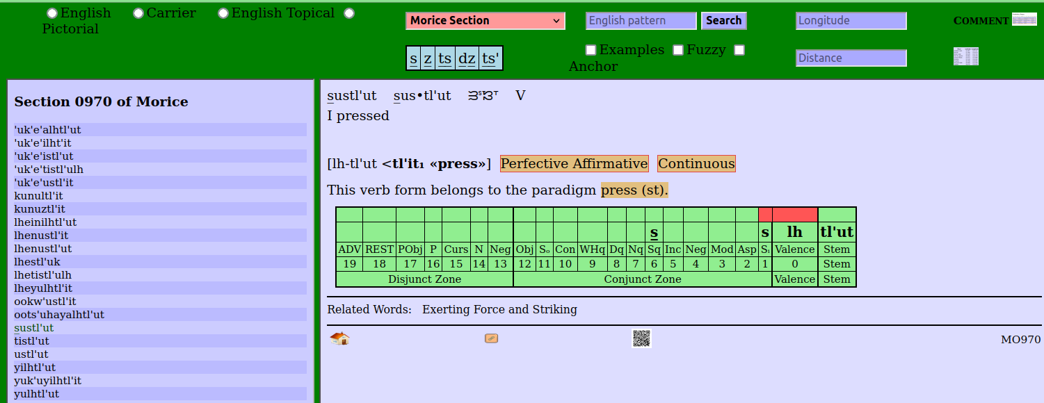 If you look up a word and it has Father Morice's book as one of its sources, the section number preceded by "MO" will be among the list of sources at lower right.